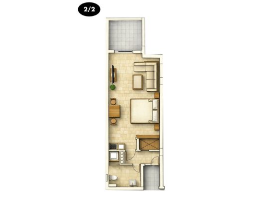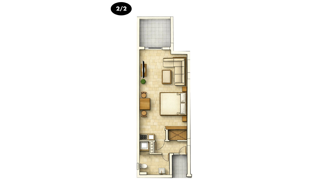 Tökéletes választás maximum 3 fős családoknak. Felszerelt konyhasarok. Kiváló választás az önellátást kedvelőknek. Ebben az apartmantípusban egy pótágy helyezhető el. Maximum 3 fő elszállásolására alkalmas. Mérete 26-28 m2.